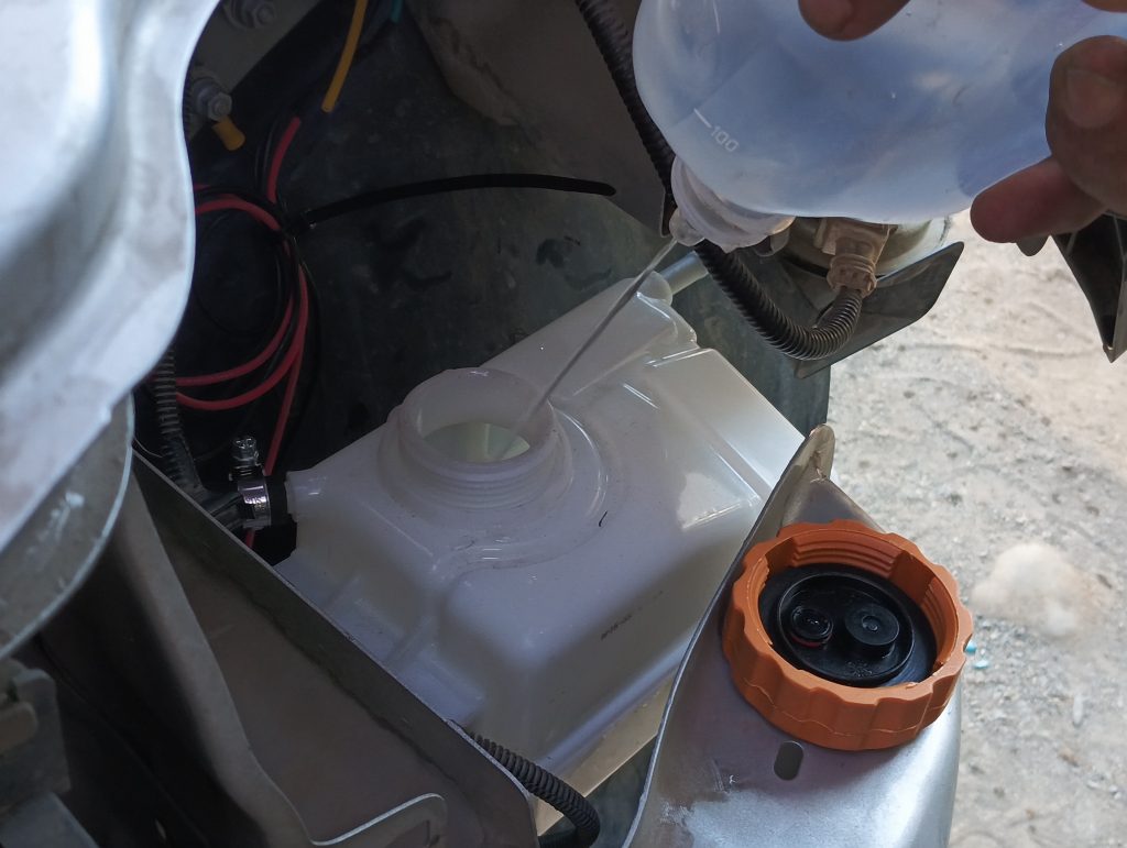 Llenar el depósito con agua bi destilada o destilada si es necesario. Cada 1000 km necesitará 1 litro de agua. Cada tres a seis meses, dependiendo de la frecuencia de uso, se recomienda revisión del sistema aplicando agua jabonosa por fuera para prevenir fugas en mangueras y conectores.